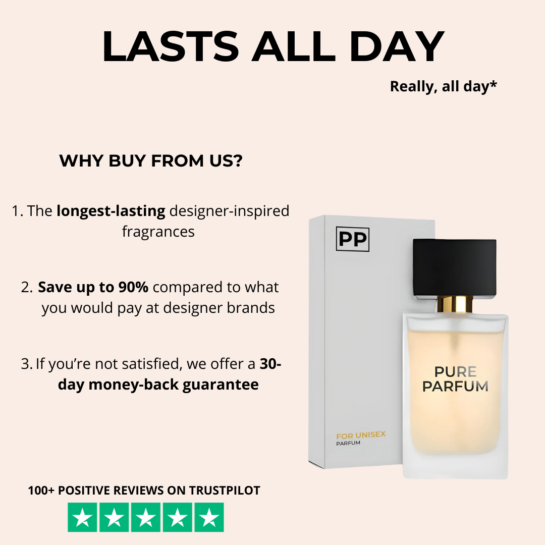 Our products are purely inspired by existing fragrances and are not identical to any other perfume or original product. Pure Parfum should not be confused with original brands, and we have no affiliation with the manufacturers of these designer brands not mentioned.